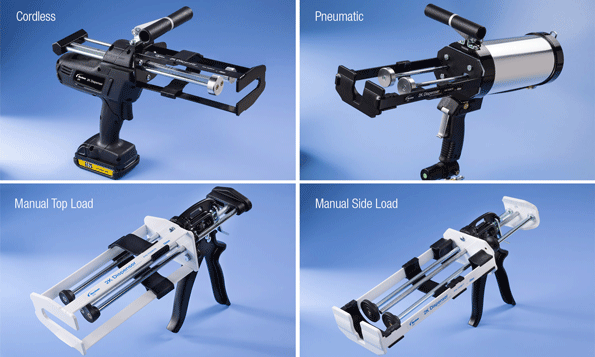A new line of manual, pneumatic, and cordless guns dispense two-component adhesives, regardless of their thickness. A 26:1 thrust ratio allows a lighter touch to dispense more material with each trigger pull. The guns have a unique secured snap feature and come in a wide variety of sizes, two-component ratio options, and loading capabilities.